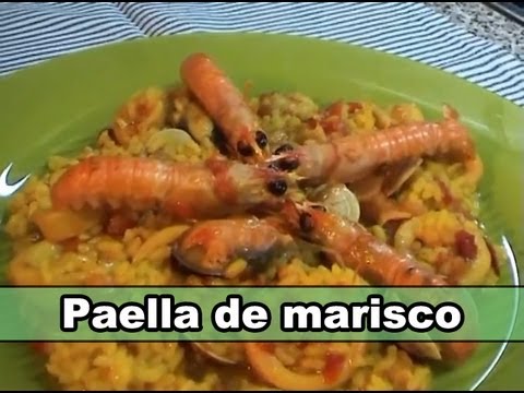 Paella de marisco. Ingredientes: aceite, pimientos, ajos, tomates, calamares, mejillones, gambas, cigalas, almejas, caldo de pescado, arroz, azafrán, agua y sal